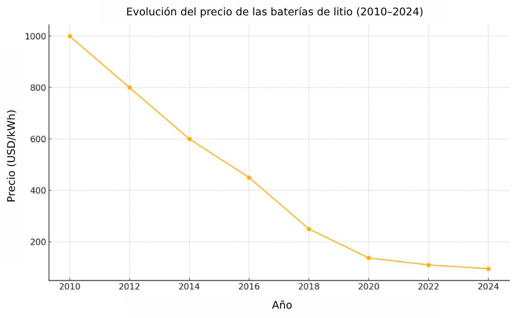 Los precios de las baterías de iones de litio han experimentado una reducción drástica durante la última década, gracias a las economías de escala y a mejoras tanto en la química como en los procesos de fabricación.