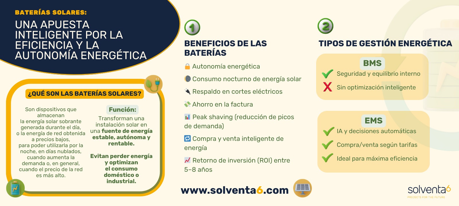 - Baterías con BMS + EMS (Energy Management System): gestión avanzada con funciones como peak shaving, load shifting o energy trading.