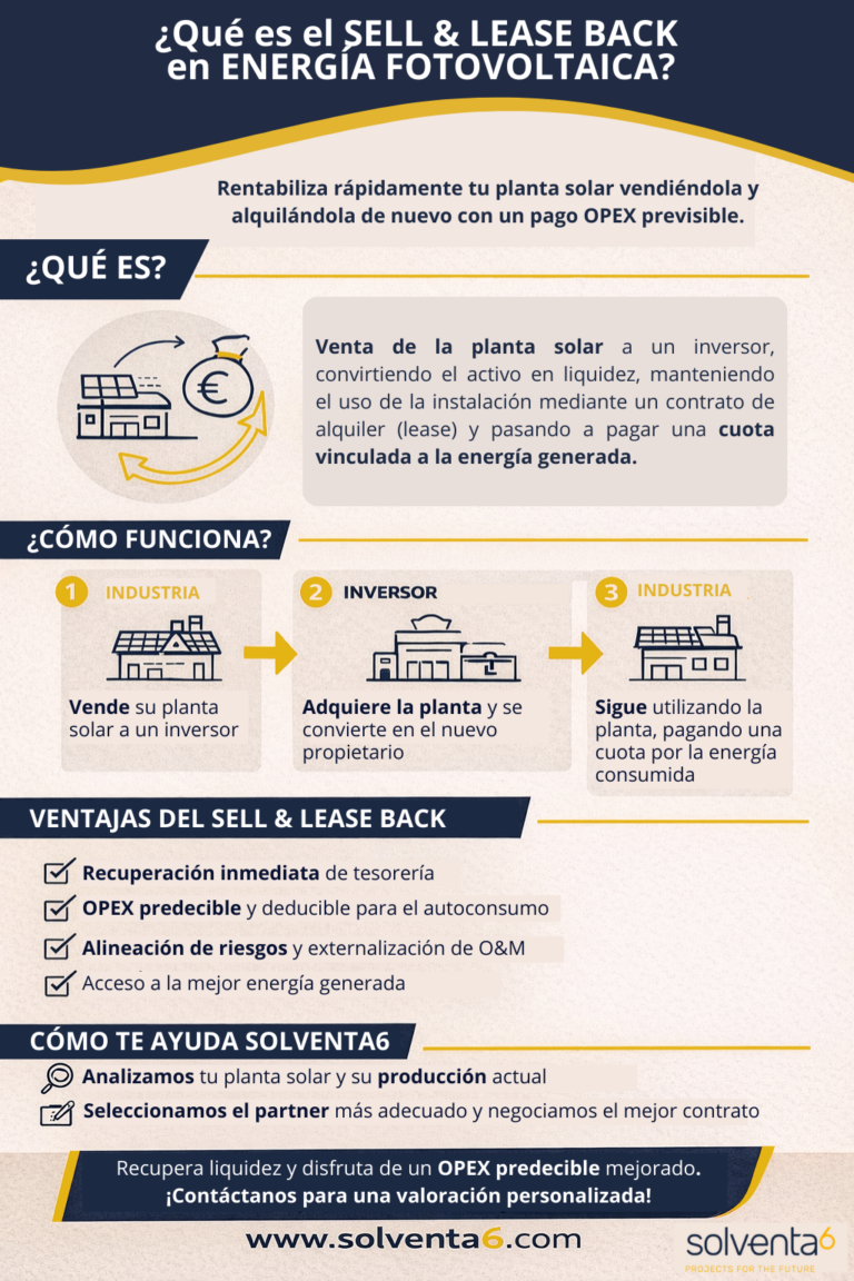 En Solventa6 incorporamos este servicio a través de un partner especializado para ofrecer nuevas opciones a aquellas empresas que ya disponen de una planta solar operativa y quieren recuperar rápidamente la inversión sin perder el acceso a la energía.