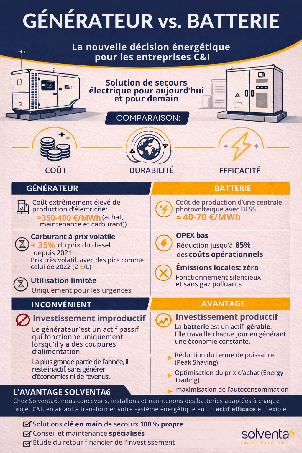 Chez Solventa6, nous croyons que l’avenir ne se construit pas avec davantage de combustibles fossiles, mais avec de l’énergie propre, un stockage intelligent et une maintenance de confiance. Et cet avenir est déjà à portée de main pour les entreprises prêtes à franchir le pas.
